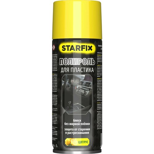 Полироль пластика STARFIX цитрус 650 мл (SM-29632-1) применяется для ухода за приборной панелью и декоративной отделки салона автомобиля.Свойства:средство восстанавливает первоначальный цвет изделия;придает поверхности блеск, не оставляет жирной пленки;благодаря содержанию в составе силиконов, защищает обрабатываемые элементы от старения и растрескивания;создает антистатический эффект;препятствует оседанию пыли;защищает от выцветания.Перед применением обрабатываемую поверхность проверить на совместимость с этим материалом на небольшом участке а незаметной области.Тщательно встряхнуть баллон в течение 5-10 секунд. Сделать пробное распыление. Проверить совместимость с обрабатываемой поверхностью на небольшом участке в незаметной области. Распылить состав по поверхности с расстояния 25-30 см. Тщательно растереть средство чистой мягкой тканью.На небольшие, труднодоступные участки, находящиеся в непосредственной близости от поверхности, на которые не рекомендуется наносить полироль (лобовое и боковые стекла, тканевая обивка потолка, сидений и др.) состав необходимо наносить с помощью губки, или тканевой салфетки.