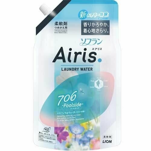 LION Прозрачный кондиционер для белья "Soflan Airis" с воздушным ароматом Poolside (мужской аромат) 850 мл, мягкая упаковка с крышкой