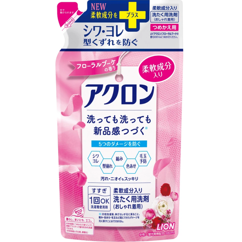 Lion Acron Floral Bouquet Средство для стирки деликатных тканей с цветочным ароматом 380 мл запасной блокЯпонское жидкое средство для стирки деликатных тканей цветочный букет LION Acron Floral. Уникальный компонент Nonion для деликатных тканей, не повреждая и не разъедая даже самые хрупкие и тонкие волокна, глубоко проникает в них и эффективно удаляет даже застарелые загрязнения, пятна различного происхождения, кожный жир с воротничков, мажет, следы пота.Оптимально подходит для стирки шелка с устойчивой окраской, кружева, гипюра, атласа, кашемира, шерсти и прочих деликатных таней. жидкое средство для деликатной стирки сертифицировано компанией Woolmark как безопасное для одежды и тканей с маркой Woolmark. Защищает от выцветания, избавляет от складок, следов отжима, растяжек.Японское жидкое средство для деликатной стирки с цветочным ароматом LION Acron Floral не содержит хлор-содержащих отбеливателей. Забота и сила в одном флаконе!Линейка продуктов LION создана с использованием новейшей технологии эффективного комфорта.