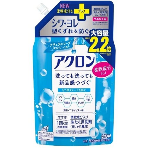 LION Жидкое средство для стирки деликатных тканей, шерсти ACRON, аромат мыла сменная упаковка 850 мл.