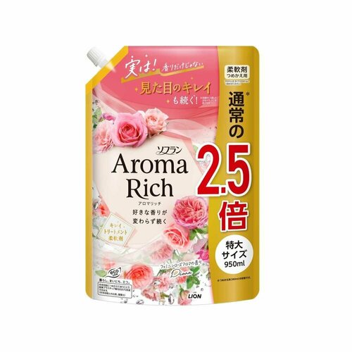 LION Кондиционер для белья Диана формула сохранения неизменного аромата и красоты тканей / с натуральными маслами Aroma Rich Diana 950 мл, мягкая упаковка с крышкой