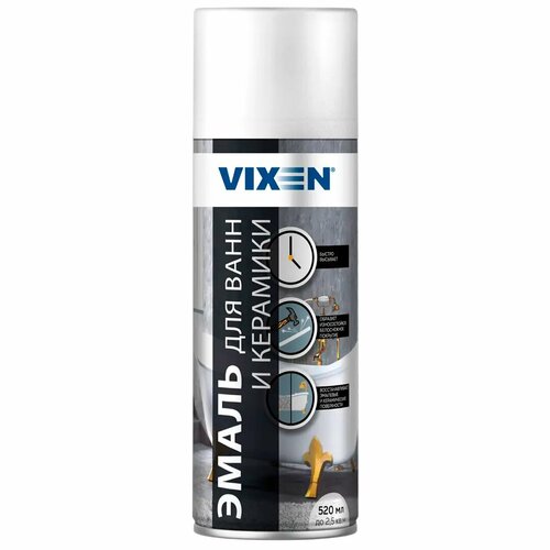 Эмаль аэрозольная для ванн и керамики Vixen — материал для восстановления поврежденных поверхностей. По завершении реставрационной процедуры образуется качественное белоснежное покрытие повышенной износоустойчивости. Вещество может применяться для ванн, холодильников, стиральных машин, керамических плит. Основные характеристики - Объем — 520 мл. - Форма — аэрозоль. - Расход — баллон на 1,5–2,5 м^2^. Рекомендации по нанесению Перед нанесением эмали следует тщательно зачистить и обезжирить поврежденные участки поверхности. Содержимое баллона перед употреблением рекомендуется взболтать в течение 2–3 минут. Материал распыляют с расстояния 25 см. Если наносится больше одного слоя, нужно сделать паузу 10–15 минут. Температура в рабочем помещении должна быть не меньше +10 °С.
