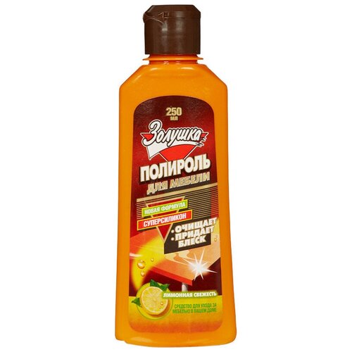 Полироль для мебели золушка Лимонная Свежесть 250мл. Назначение: Средство предназначено для ухода за мебелью - полированной и неполированной, а также для чистки и придания блеска поверхностям из пластика, эмалированным поверхностям. Средство удаляет жирные пятна и грязь, позволяет скрыть царапины и освежает внешний вид. Формула, сочетающая воск и силикон, обеспечивает блеск и защиту от влаги, повышает стойкость поверхности к загрязнениям и пыли. Способ применения: Взболтайте. Нанесите немного средства на чистую ткань и равномерно разотрите по поверхности, затем располируйте до блеска сухой мягкой тканью. После этого дайте поверхности просохнуть 15-20 минут. Меры предосторожности: Беречь от детей. При попадании средства в глаза промыть большим количеством воды.