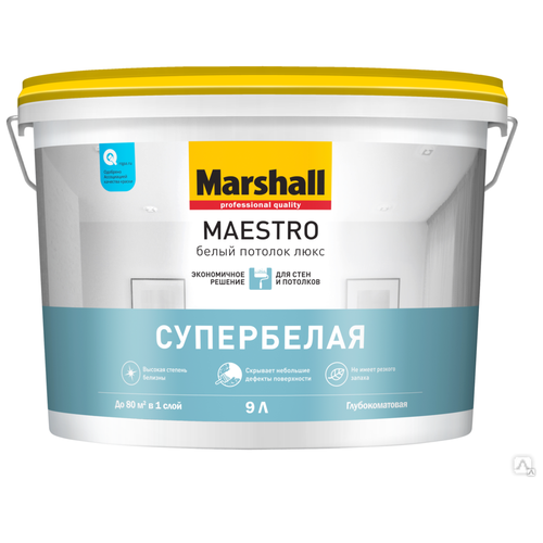 Краска для стен и потолков Marshall Maestro 20 л - белоснежная глубокоматовая водно-дисперсионная краска для потолков и стен. Благодаря высокой укрывистости скрывает небольшие дефекты поверхности, визуально делая ее более ровной и придавая потолку отличный декоративный вид. Краска легко наносится, без разбрызгивания и потеков, не оставляя следов от инструмента.ПреимуществаПрименениеДля внутренних работ. Подходит для нанесения на полностью просохшие минеральные поверхности (бетон, штукатурка, кирпич и т. п.). Рекомендуется для окраски потолков в комнатах с умеренной влажностью.Внимание! Товар весом более 25 кг. необходимо перемещать минимум двумя людьми или с помощью механизированного оборудования.Цветовая палитра: БелыйСтрана производства: РоссияВнешний вид: ГлубокоматовыйПлощадь покрытия (м²): 180.0Предназначен для: ПотолокРасход (м²/л или м²/кг): 9Основа: ВоднаяМатериал поверхности применения: Бетонные подложки, Гипс, Гипсовая панель, Гипсокартон, Гипсокартонная плита и гипсокартон плако, Кирпич, Строительный блокВремя высыхания между 2 слоями (ч): 1.0Время полного высыхания (ч): 4.0Тип полимера: АкрилЭкологическая сертификация: ОтсутствуетСрок службы покрытия (лет): 3Тип продукта: Краска для внутренних покрытийВозможность колеровки онлайн: НетБаза под колеровку: AТип базы под колеровку: Для пастельных цветов (белая)Вес, кг: 32.685Назначение: Гардеробная, Гостиная, Коридор, Коммерческое помещение, СпальняЗапах: С запахомРасход (в м² / л): 9Моющийся: НетТип ЛКМ: На водной основеЦвет: БелыйУход: Только сухая чисткаМарка: MARSHALL MAESTROТип помещения: Жилая комнатаГотов к использованию: ДаОбъем (л): 20.0