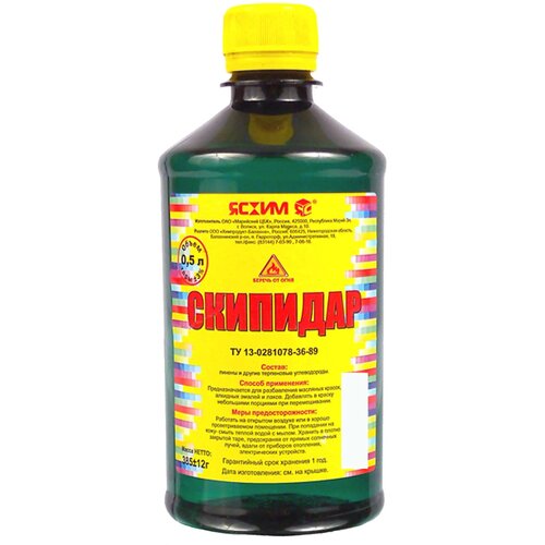 Скипидар представляет собой смесь терпеновых углеводородов и терпеновых спиртов. Является побочным продуктом при получении целлюлозы сульфатным способом. Применяется для разбавления масляных красок, алкидных эмалей и лаков, мастик на основе битума и каучука.Объем - 0.5 л.