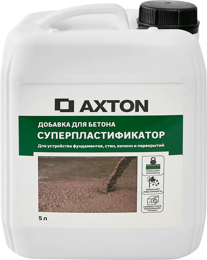 Суперпластификатор Axton — это специальная добавка, которую вводят в цементную или бетонную смесь с целью улучшения ее физико-химических характеристик. Используется при изготовлении товарного бетона, производства железобетонных конструкций нормального твердения, работе с бетонами высоких классов или на пористых заполнителях, изготовлении густоармированных или особо ответственных конструкций, приготовлении ремонтных растворов, возведении еврозаборов, изготовлении шлакоблоков, тротуарной плитки и мелкоштучных изделий, работы с гидротехническим или дорожным бетоном. Особенности: - поскольку скорректировать основной состав бетона нельзя, использование суперпластификатора становится хорошим способом улучшения его характеристик; - объем — 5 л.