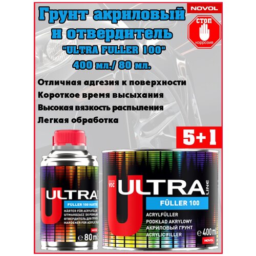 Грунт NOVOL "ULTRA FULLER 100", 2К, акриловый, серый, 5+1, банка 400 мл. с отвердителем 80 мл.
