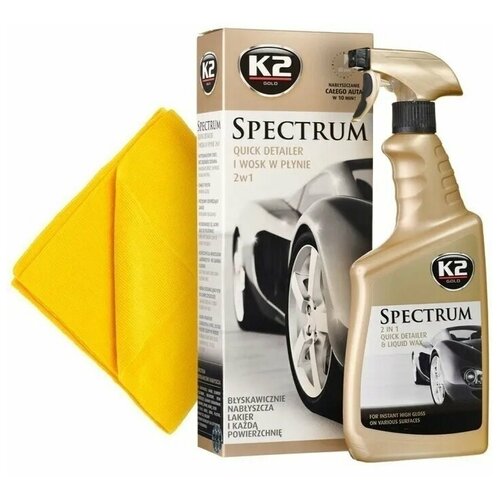 Уникальный синтетический жидкий воск, созданный на основе самых новейших технологий. Прост в использовании - достаточно брызнуть на поверхность кузова, а потом протереть, не дожидаясь пока воск высохнет. K2 SPECTRUM легко полирует и не оставляет белых пятен. Подходит для всех типов лака. Можно применять на разогретой поверхности. Имеет тысячу применений, идеально подходит для обновления пластмассы, фар, панели, хромированных элементов, резиновых, шин, кожи и стекол.