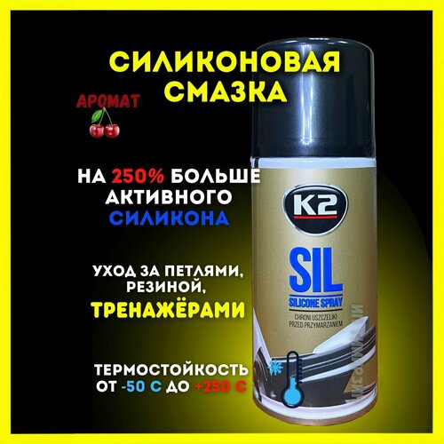 Универсальная многоцелевая силиконовая смазка для авто K2 Silicone spray идеальное профессиональное средство для ухода за вашим авто. Силиконовая смазка спрей очень эффективна для резиновых уплотнителей любого транспортного средства. Отлично показывает себя как удобная безопасная автокосметика. Защищает резиновый уплотнитель, уплотнитель капота от примерзания к кузову машины, смазывает запчасти для велосипеда, замок гаражный, замок оконный на окна, замок капота, хорошо подходит для петель. В зимнее время эффективно предотвращает примерзание дверей автомобиля после мойки или во время оттепели. Силиконовая смазка для авто значимое повседневное средство категории автотовары. K2 Silicone spray антискрип представляет собой оптимальный качественный аналог WB 40 (wd40 ВД 40 wd-40), содержит высокую концентрацию силикона. Водостойкая водоотталкивающая аэрозольная формула обеспечивает защитное, водонепроницаемое покрытие с низким коэффициентом трения на всех поверхностях (в том числе на пвх поверхностях). Аэрозольное средство создает тончайшую пленку на поверхности, которая отталкивает воду и грязь, препятствуя появлению коррозии, снижает износ деталей, обеспечивает плавный ход механизмам. Многоцелевое средство для авто K2 Silicone используется не только как эффективная автохимия. Продукт прекрасно подходит для применения в быту: предотвращает заедание и скрип замков, защищает фурнитуру дверей, направляющих и пластиковых окон, продлевает срок службы резины и резиновых уплотнителей, работает как жидкий ключ для замков. Может использоваться для беговых дорожек, спорт инвентаря и тренажеров, отлично показывает себя как продуктивное антикоррозийное средство (предотвращает ржавчину и коррозию на всех типах выдвижных механизмов – защитит ящик, полки, раздвижные ставни, кран на кухне и в ванной, любой поршневой движок, замок на окно/замок оконный, окно пластиковое, замок из стекла), обеспечивает антискрип металлических элементов и деталей. Безопасна для пластика. Может использоваться для ухода за всеми видами швейных машин (включая электронные швейные машины). Для ухода за велосипедом продукт подойдет как смазка для велосипеда, заменив обычное велосипедное масло/силиконовое масло (такое как стандартный вязкий синтетический солидол). Применяется в том числе для цепи велосипеда, других вело запчастей и деталей. Смазка велосипедная применяется если у вас есть детский велосипед коляска или детский электромобиль электро кар, чтобы обеспечить бесперебойную работу механизмов на всю весну, лето и осень. Лубрикант изготовлен с учетом европейских стандартов качества, может эффективно заменять профессиональную автокосметику. Спрей экономичен в использовании. Дозатор имеет контролируемый объем распыления, обеспечивающий ровное покрытие. После нанесения продукт покрывает небольшие зазоры и трещины, обеспечивая водонепроницаемое уплотнение. Предотвращает прилипание, примерзание, старение деталей, дополнительно защищает электрокомпоненты (высоковольтный провод, клемм и т. д.), улучшает диэлектрические свойства изоляции элементов, предотвращает утечку тока, приводящую к перебоям в работе двигателя и затрудненному пуску. Состав аэрозоля K2 Silicone предлагает безупречно разработанные химические решения для защиты и ремонта большегрузных автомоб