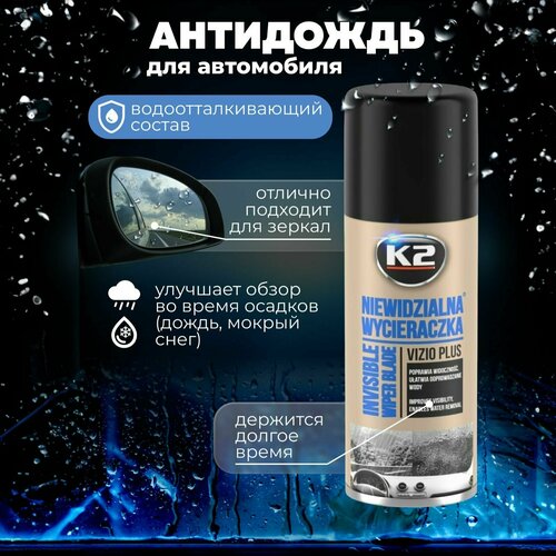 Антидождь VIZIO K2 - это гидрофобное покрытие, которое облегчает отвод воды со стекол автомобиля вовремя движения под дождём. Благодаря простоте нанесения быстро создает защитное покрытие на поверхности, которое отталкивает воду от лобовых стекол и автомобильных фар. Уже на скорости 55 км /ч вода под действием воздушного потока самостоятельно стекает, обеспечивая лучшую видимость и повышенную безопасность водителя в дождливую погоду. Невидимый дворник обеспечивает больший комфорт во время вождения в плохую погоду и позволит автомобильным дворникам легче избавляться от капель дождя, мокрого снега и града. Особенности продукта: -однокомпонентный продукт для нанесения на автомобильные окна и фары; -создает гидрофобное покрытие, эффективно отталкивающее воду; -защитный слой держится на стекле и действует несколько недель;-уменьшает количество отложений грязи и инея на стекле; -улучшает видимость при движении под дождем. Указания по применению: 1. Стеклянную поверхность тщательно вымыть и обезжирить (можно использовать средство K2 Очиститель стекол NUTA. 2. Нанесите антидождь на микрофибру или прямо на стекло и равномерно распределите по поверхности круговыми движениями. 3. После высыхания удалить остатки сухой или слегка влажной микрофиброй и отполировать до полной прозрачности для более удобного нанесения средства рекомендуем воспользоваться полотенцем из микрофибры K2PRO OPTI). 4. Для усиления эффекта нанесите еще один слой через 20 минут (полный эффект - через 8 часов после нанесения). Автомобильный антидождь – незаменимое средство для окон, стекол и зеркал авто в любое время года. Гидрофобное покрытие на лобовое стекло создает эффект затуманенности, в то время как наш стеклоочиститель наоборот улучшает обзор во время движения. Спрей имеет олеофобную функцию, благодаря которой капли дождя и растаявшего снега стекает с боковых стекол и зеркал. Гидрофобное покрытие улучшает обзор при неблагоприятных погодных условиях, что снижает риск возникновения ДТП. Способ применения: в первую очередь необходимо очистить стекло и зеркала от снега при помощи скребка или от грязи и пыли при помощи тряпки. Далее протрите обрабатываемые поверхности сухой тряпкой. После того как все стекла станут сухими, нанесите состав на все поверхности и разотрите его мягкой тканью из микрофибры до тех пор, пока стекло не станет полностью сухим и прозрачным. Защитный слой держится несколько недель, после чего рекомендуется повторить обработку поверхностей. Спрей не влияет на работу дефлектора. Средство подойдет для использования на всех марках автомобилей: лада гранта, лада приора, ауди и прочие. Помимо зеркал и стекол, состав можно использовать для покрытия фар. Таким образом, они будут светить ярко и четко даже во время проливного дождя. Водоотталкивающая функция спрея защищает пластик автомобиля, так как капли воды сразу же с них стекают, не оставляя разводов. Защита фар и стекол особенно важна зимой, так как на улице рано темнеет, а качественное освещение чаще всего отсутствует. Если еще и на стеклах заднего вида начнет скапливаться вода или ветровики будут оставлять разводы, то о безопасном вождении не может быть и речи. Также жидкость помогает от излишнего запотевания во время прогрева автомобиля. Летом спрей анти дождь тоже пригодится каждому влад