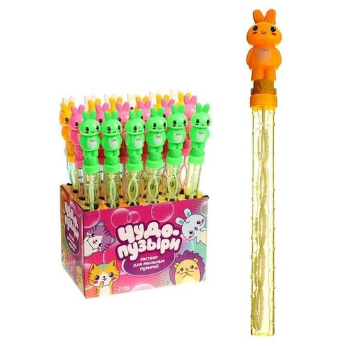 Мыльные пузыри «Зайчики в бабочке» 37х3х4 см. Выдувание мыльных пузырей — одно из любимых занятий детей, вызывающее восторг и улыбку! Увлекательно не только пускать, но и ловить воздушные переливающиеся шарики на ладошку так, чтобы они не лопнули.Правила обращения с раствором:1. Выдувать на расстоянии 10 см от лица.2. При попадании в глаза промыть большим количеством воды.3. Внимание! Не глотать мыльный раствор. Если всё-таки это случилось, немедленно промойте желудок, обратитесь к врачу.Рекомендовано для детей от 3 лет.