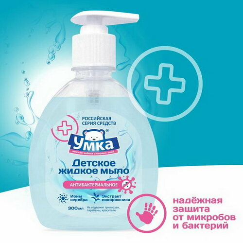 Артикул: 1676-704. Вес: 358 гр, Размер упаковки: 10 x 15 x 5 см, Запрет реализации по сегментам: 00000000208, Температурное ограничение: Нет, Тип: Жидкое, Вид мыла: Детское, Вес, г/Объём, мл: 300. Детское антибактериальное жидкое мыло "Умка" с экстрактом подорожника, ионами серебра и ундециленовой кислотой (Тетранил-У) обеспечивает надёжную антибактериальную защиту, не нарушая естественные защитные функции кожи. Высокотехнологичный бактерицидный состав мыла, который не только уничтожает, но и блокирует размножение вирусов и микроорганизмов, и при этом прекрасно совместим с кожей, безопасен для детского организма, не подавляет местный иммунитет. Способ применения: нанести небольшое количество на влажную кожу, вспенить, смыть водой. Меры предосторожности: не рекомендуется при индивидуальной непереносимости компонентов продукта. Состав/Ingredients/INCI: Aqua, Sodium Laureth Sulfate, Sodium Chloride, Cocamide DЕА, Phenoxyethanol, Ethylhexylglycerin, Coco Glucoside, Glycerin, Undecylenamidopropyltrimonium Methosulfate, Parfum, Citric Acid, Panthenol, Plantago Major Leaf Extract, Water Suspension Of Silver, Laureth-7 Citrate. .