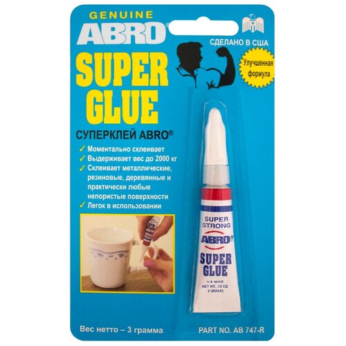 ABRO Клей-супер "ABRO" (3г). Cодержит цианоакрилат. Предназначен для моментального склеивания металлических, пластмассовых, деревянных, резиновых и почти всех непористых поверхностей, за исключением некоторых пластмасс, тефлона, пенорезины и ткани. Устойчив к перепадам температуры и большинству химикатов. Моментально склеивает. Склеивает любые.