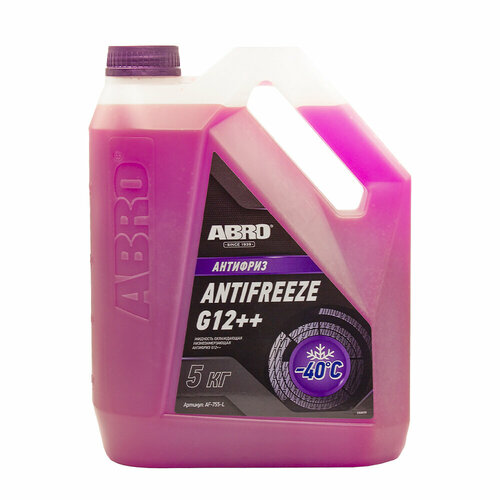 Антифриз фиолетовый G12++ ABRO 5кг - жидкость охлаждающая низкозамерзающая категории G12++ на основе этиленгликоля высшего качества и деминерализованной воды высшей степени очистки с уникальным пакетом современных присадок. Сфера применения: предназначена для использования в системах охлаждения во всех двигателях внутреннего сгорания (бензиновых и дизельных) легковых автомобилей, автобусов, работающих при низких и умеренных температурах. Свойства: Обеспечивает надёжную работу системы охлаждения двигателя при температуре окружающей среды от -40°С до +50°С; Обеспечивает повышенную антикоррозийную защиту металлов и сплавов; активизируется только в зонах коррозионного поражения, сохраняя эффективный теплообмен; Предотвращает образование накипи; Соответствует стандартам и требованиям: VW TL 774 G; MAN 324 Typ Si-OAT; MB-Approval 325.5; Cummins CES 14603; Совместим с любыми антифризами, не содержащими нитриты, амины, фосфаты. Состав: вода деминерализованная, этиленгликоль, пакет присадок, краситель.Объем/вес: 5 кг