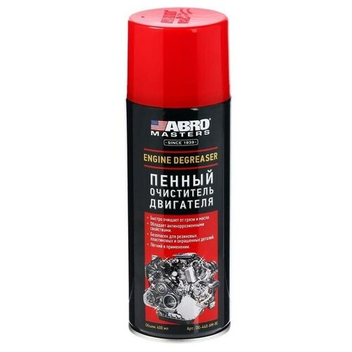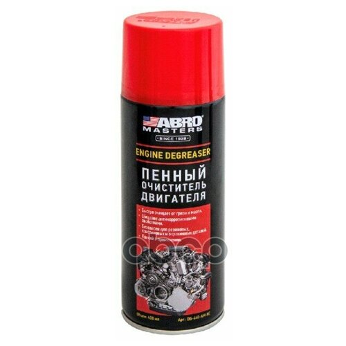 Очиститель двигателя пенный ABRO, 400 мл DG-440-AM-RE. Быстро впитывается и растворяет все виды грязи и масла с автомобильных, судовых и промышленных двигателей. Просто распылите очиститель, подождите 5 минут и смойте водой. Способ применения: Защитите трамблер, карбюратор, катушку зажигания и воздухозаборник от попадания очистителя на них. Также защитите электронные датчики и провода. Встряхните баллон и распылите на охлажденный сухой двигатель до образования пены. Подождите 5 минут до полного растворения грязи. Сильно загрязненные участки очистите с помощью щетки. Смойте грязь струей воды, направленной вниз. Открыв защищенные поверхности и поставив на место все снятые детали, запустите двигатель и дайте ему поработать 5–10 минут до полного высыхания7394691)