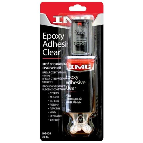 ЭпоксидныйКлей IMG прозрачный 25 мл MG-426 представляет собой высокопрочный полимерный адгезив на основе эпоксидной смолы. Продукт прочно склеивает большинство материалов в любых сочетаниях: стекло, металлы, дерево, пластик, керамику, фарфор, резину, кожу, стекловолокно. Отлично заполняет пустоты и трещины. Обладает высокой стойкостью к вибрации и механическим нагрузкам: не изменяет объем, не дает усадки, не деформируется. Обладает превосходной стойкостью к воде, бензину, дизельному топливу, антифризам, растворителям, моторным, трансмиссионным и гидравлическим маслам. Не ржавеет и не вызывает коррозию металлических деталей. Устойчив к агрессивному воздействию кислот, щелочей и растворителей.Время схватывания – 5 минут, время отверждения – 1 час. Максимальная прочность достигается через 24 часа при комнатной температуре.