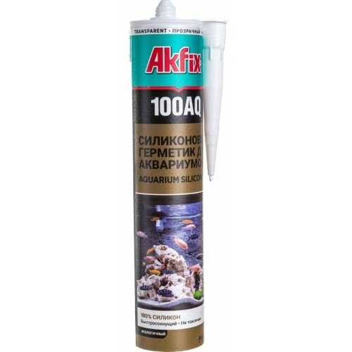 Akfix 100AQ (прозрачный) - нетоксичный, не содержащий растворителей силиконовый герметик, предназначенный для изготовления и ремонта аквариумов, а также для работ по остеклению. **Основные свойства и преимущества:** - 100% силикон без растворителей - Нетоксичен для рыб и водных организмов - Водостойкий, устойчив к ультрафиолету и многим химикатам - Однокомпонентный, застывающий под воздействием влажности воздуха - Сохраняет эластичность при низких и высоких температурах - Быстро схватывается - Обеспечивает высокопрочное соединение **Область применения** - Изготовление и ремонт аквариумов, террариумов, а также других герметичных изделий и конструкций из стекла - Применяется для монтажа стеклянно-алюминиевых конструкций - Остекление витрин, герметизация окон и дверей - Герметизация систем вентиляции и кондиционирования Применение: Убедитесь, что поверхности сухие и очищены от загрязнений. Температура применения от +5 °C до +40 °C. После нанесения, в течение 5 минут, герметик должен быть разглажен(с легким давлением) резиновым шпателем для плотного равномерного заполнения шва и надежного соединения деталей. Излишки незастывшего герметика удалите растворителем. Застывшие остатки могут быть удалены механически. Для соединения элементов конструкций толщиной от 6 до 12 мм минимальная рекомендуемая глубина шва составляет 6 мм. При изготовлении аквариумов, рекомендуется выдержать минимальный срок 21 день до начала их эксплуатации. Ограничения: