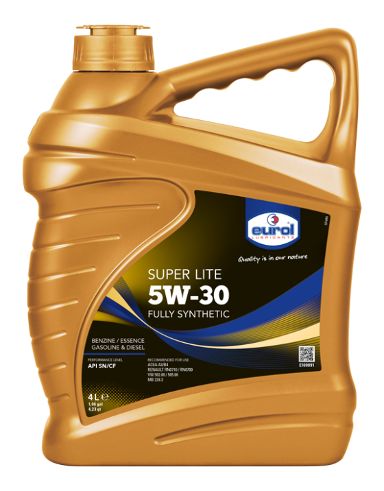 EUROL SUPER LITE 5W-30 Полностью синтетическое масло для бензиновых и дизельных двигателей легковых автомобилей и легкого коммерческого транспорта. Это масло может использоваться в двигателях с турбонаддувом и без, оборудованных катализаторами, а также в моторах с прямым впрыском топлива. Обеспечивает стабильную масляную пленку при холодном запуске и сохраняет ее при высоких температурах и тяжелых условиях эксплуатации. Обеспечивает отличную защиту от износа, коррозии и окисления, специальные присадки сохраняют двигатель в чистоте и предотвращают образование отложений и нагара. Обладает топливной экономичностью и может смешиваться с синтетическими и минеральными моторными маслами.СПЕЦИФИКАЦИИ:ДопускиAPI SN/CFРекомендацииACEA A3/B4VW 502.00MB 229.3Renault RN0710Renault RN0700VW 505.00ФИЗИЧЕСКИЕ ХАРАКТЕРИСТИКИ:Цвет КоричневыйПлотность при 20°C 0.848 kg/lКинематическая вязкость при 40°C —66.2 cStКинематическая вязкость при 100°C 11.2 cStИндекс вязкости 170Вязкость, динамическая (CCS)5590 cPЗольность 1.31 wt%Температура вспышки 230 °CТемпература застывания-45 °C