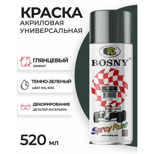 Аэрозольная краска в баллончике Bosny № 12 акриловая универсальная, цвет темно-зеленый, RAL 6012, (BOSNY NO. 12), 520 мл