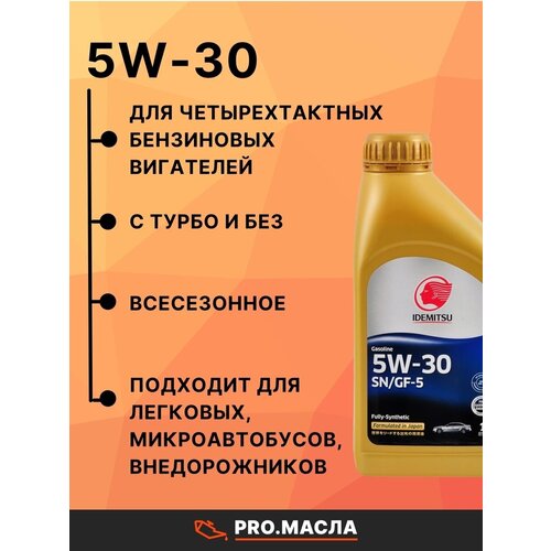 Масло моторное Идемитсу IDEMITSU 5W-30 - синтетическое моторное масло для бензиновых двигателей, соответствующее новейшей спецификации API SN. Моторное масло идемитсу 5W30 обеспечивает уверенный пуск в зимний период эксплуатации при температурах до -30 С. Сохраняет превосходные смазывающие свойства и обеспечивает чистоту двигателя, что способствует увеличению срока его службы.