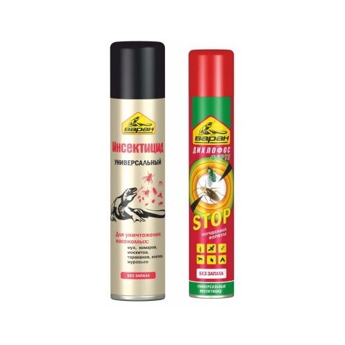 Универсальные инсектициды Варан - это аэрозольное средство для уничтожения нелетающих (муравьи, клопы, тараканы, блохи, кожееды) и летающих (мухи, комары, москиты, бабочки моли) насекомых. В комплекте 2 баллона - Инсектицид Варан® Форте и Инсектицид Варан® А