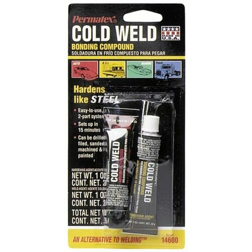 Холодная сварка духкомпонентная 56 гр PERMATEX 14600. Холодная сварка духкомпонентная 56 гр PERMATEX 14600 Холодная сварка PERMATEX стальной компаунд, двухкомпонентный, тюбики 28г.+28 г. 14600 имеет эпоксидный клеящий состав. После полного застывания поверхность можно сверлить, нарезать в нем резьбу или обрабатывать напильником. Сварка устойчива к воздействию технических и очищающих жидкостей. Выдерживает температуру до 149С.