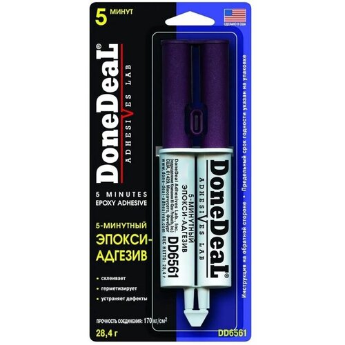 Клей 5 минутный прозрачный эпоксидно адгезивный в шприце 28,4 г Done Deal. 5-минутный эпокси-адгезив обеспечивает качественное и долговечное соединение. Быстро и надежно склеивает в любых сочетаниях металлы, сплавы, большинство пластиков, керамику, стекло, дерево, различные строительные материалы. После полимеризации безвреден, устойчив к воздействию нефтепродуктов, воды, растворителей. Обладает хорошими эксплуатационными характеристиками, не дает усадки, выдерживает постоянные и переменные нагрузки в интервале температур от -55 до +125С. Прочность соединения: 170 кг/см.