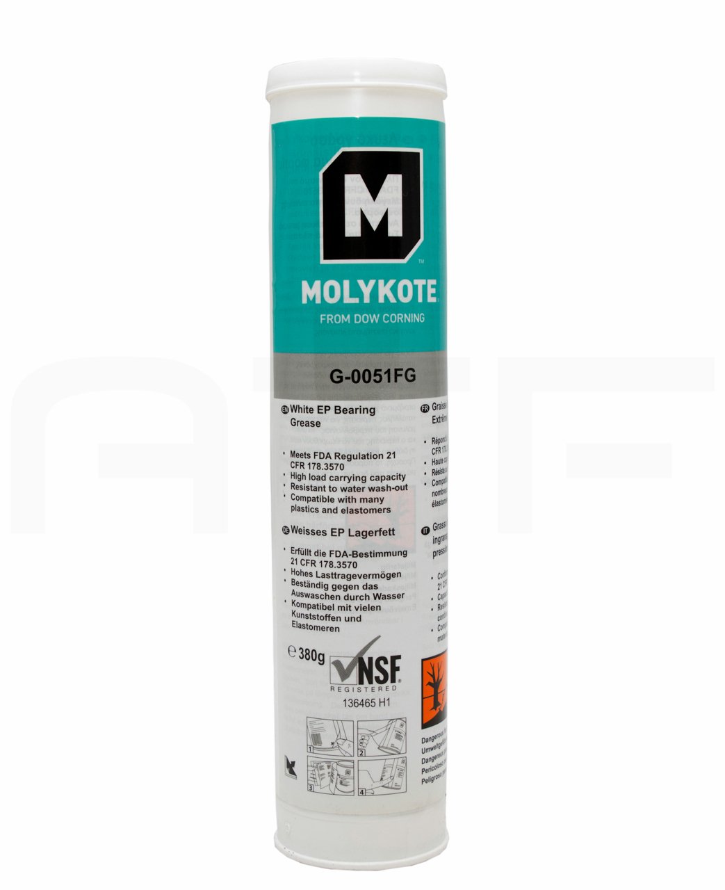 Комплексная алюминиевая пластичная смазка Molykote G-0051 FM White EP BG с пищевым допуском предназначена для высоких нагрузок. Она используется для подшипников качения и скольжения, направляющих скольжения и качения, зубчатых закрытых передач, а также цепных передач.