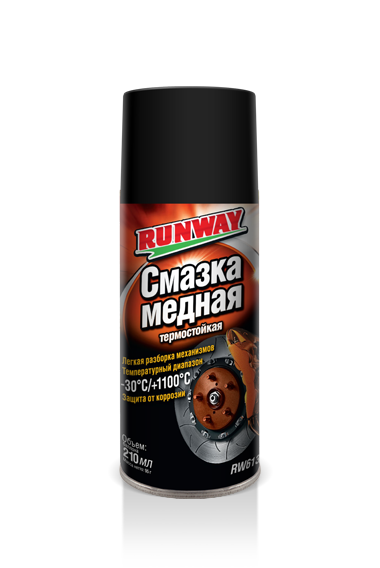 Температурный диапазон применения от -30°С до +1100°С. Медная смазка RUNWAY подходит для узлов и деталей автомобилей, подвергающихся высоким термическим нагрузкам.